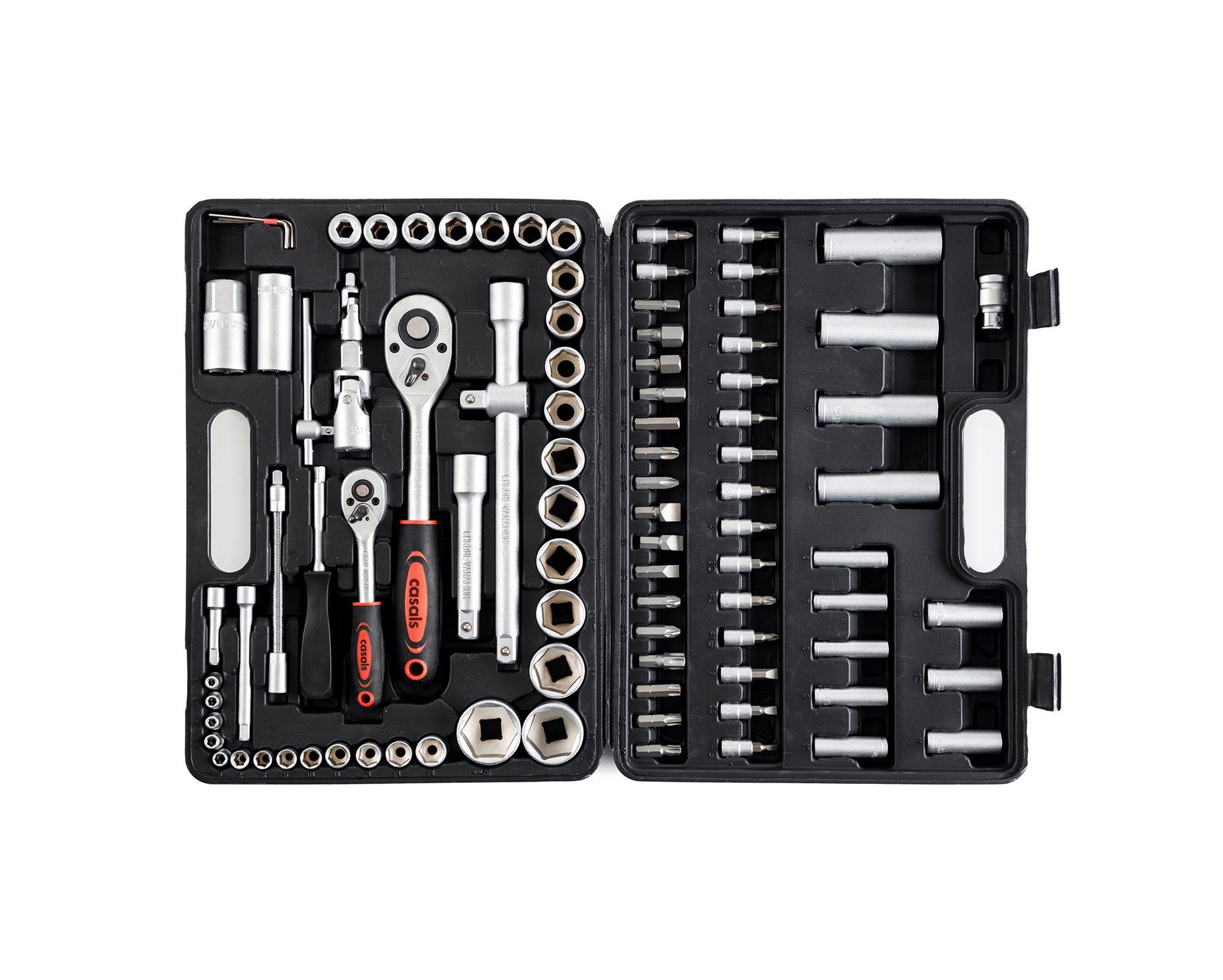 Unleash your inner fix-it hero with Casals' 94-piece socket set! This comprehensive kit tackles any home project, big or small. Whether you're tightening a screw, bleeding your brakes, or assembling furniture, this versatile set has you covered. Each tool is neatly stored in a durable carrying case for easy organization and portability. Never get caught without the right tool again! Upgrade your DIY skills today with Casals – the perfect socket set for every household.